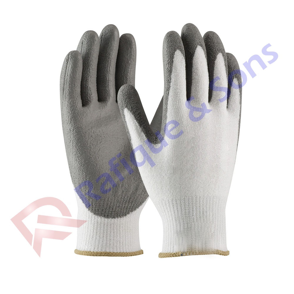 Seamless grey-flecked jersey made of HPPE fibres (polyethylene) with knitted cuff and black polyurethane coating on the palm and fingers