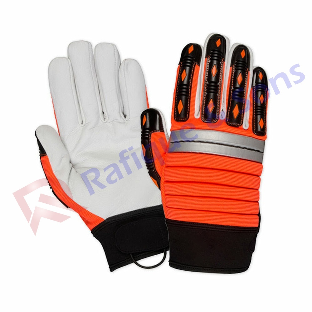 Goat leather palm, accordion style extra firm EVA foam padded back, TPR strips on back of fingers and thumb, orange spandex back, reflective knuckle strap, neoprene cuff with velcro closure, loop to hang gloves.